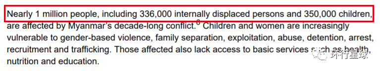 根據2021年聯合國兒童基金會公佈的《針對兒童的人道主義援助行動》,目前有約33.6萬個難民,和35萬個兒童向聯合國發出求救信號,其中婦女和兒童最易受到兩性暴力、流離失所、剝削、性侵、拘留、逮捕、徵兵和拐賣等的傷害。