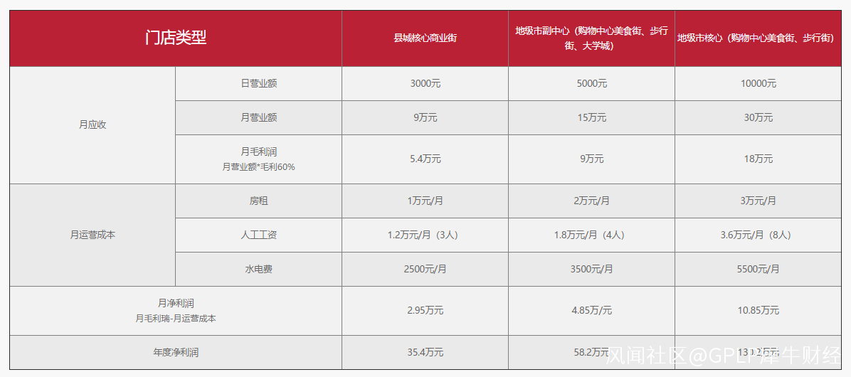 根據喜姐炸串的官網,一家縣城核心商業街的日營業額可達3000元,地級市副中心日營業額可達5000元,地級市核心可達10000元。即便是在縣城核心商業街,一家店的年淨利潤也可達到35.4萬元。並且,從喜姐炸串給出的參考數據來看,開一家炸串店的毛利率有可能達60%。