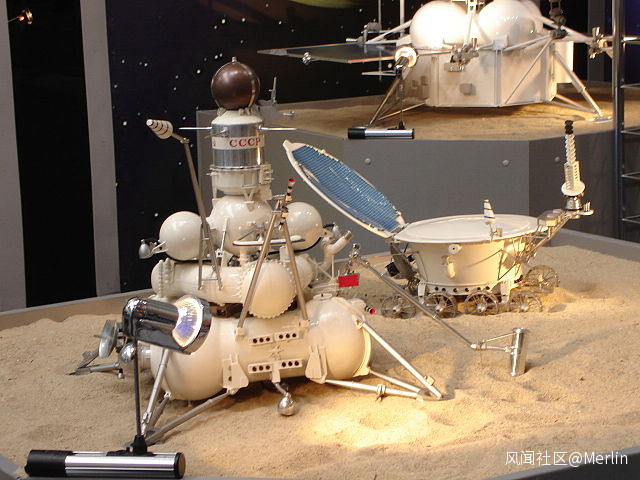 ——下圖是前蘇聯月神20號無人登月飛船(模型)。月神20號於1972年2月21日安全降落在月球上,並於25日攜帶了55克月面土壤標本,安全降落在哈薩克斯坦傑茲卡茲甘鎮以北40公里的 Karkingir 河中的一個島上。