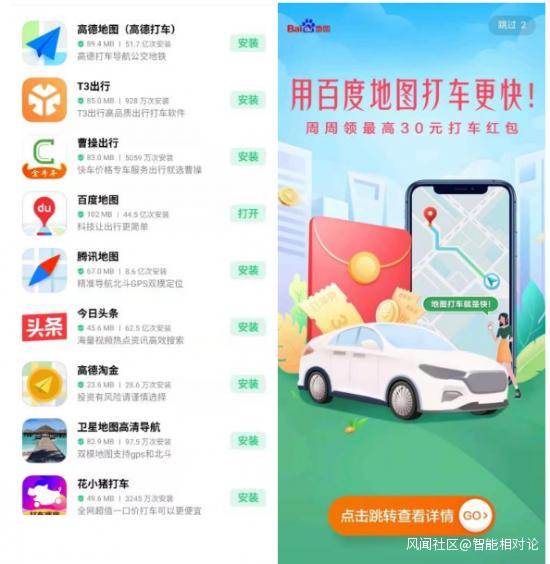 在過去的4個月時間內,阿里系的高德地圖狂發打車補貼,甚至在應用商店上直接拓展名字為“高德打車”;百度地圖也同步加大廣告投入和關鍵詞強調“打車”相關優惠,App啓動頁廣告直接換成“用百度地圖打車更快!”的標語。