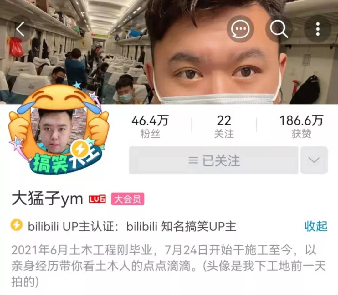 他,就是大猛子ym。10月29日,他發佈的視頻《工地一天50000步,也不耽誤胖20斤》播放量達到71.2萬;同一天,號稱世界500強第13位的“中國建築”官方B站號發佈的視頻播放量為1.1萬。這就是大猛子,一位短視頻運營能力吊打世界500強公司的砼人。