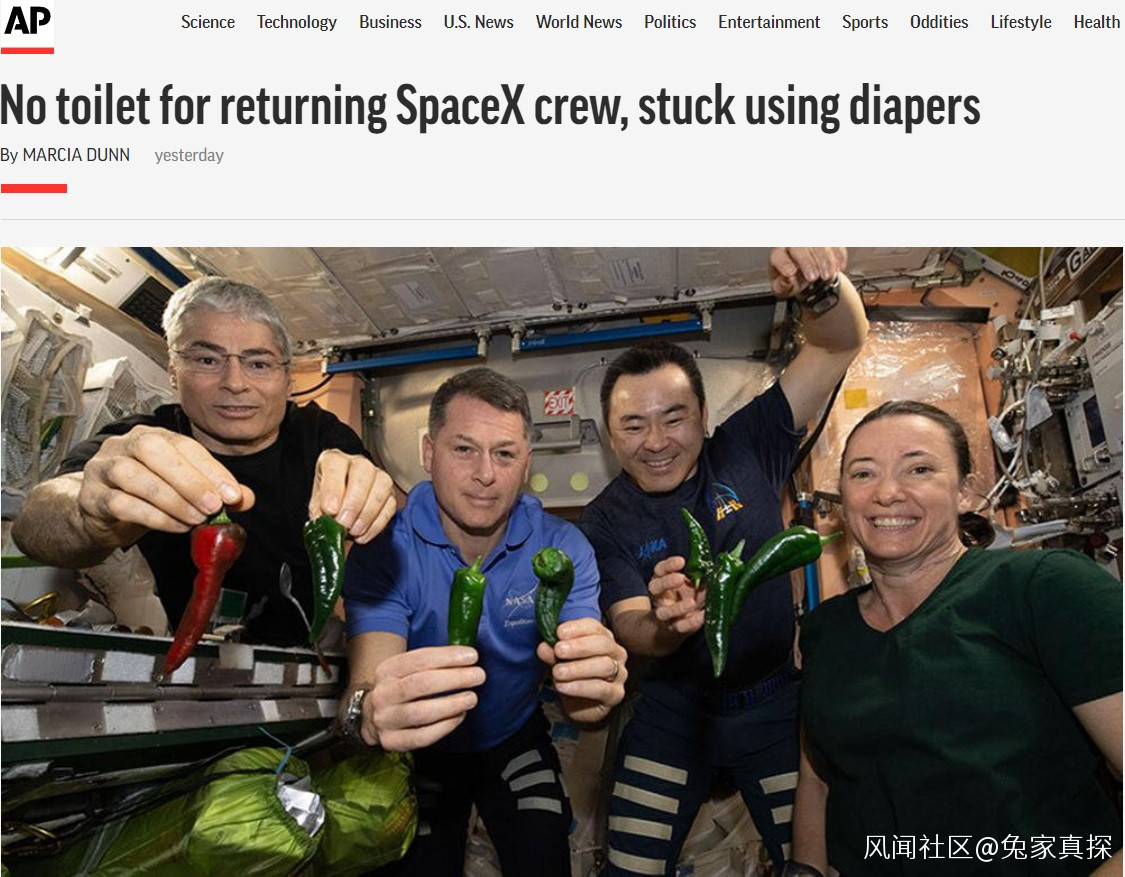 美聯社:週日離開國際空間站的宇航員在回家的路上將被困在尿布上,因為他們的太空艙廁所壞了。
