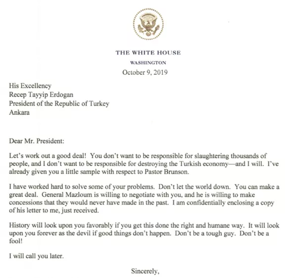 這可不是埃爾多安第一次對美國翻白眼,2019年10月9日,彼時還是特朗普當總統,由於敍利亞問題正在焦灼,在聽聞土耳其可能兵發敍利亞後,特朗普急忙以官方名義給埃爾多安發了一篇聲明,這就是著名的“別當個傻瓜”的聲明,聲明如下: