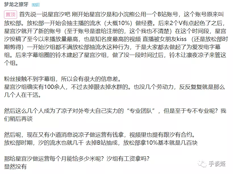 在這則視頻下方,有知情人士介紹了星宮汐字幕組的由來,並且對組長的正當性和收益分配提出質疑。