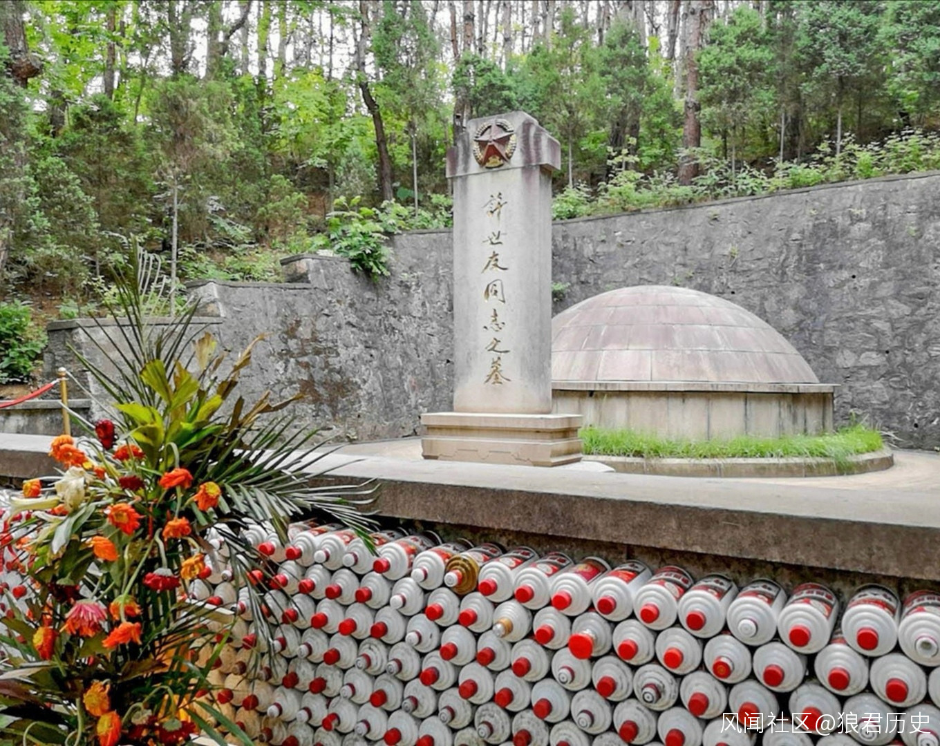 在經歷各種嘗試後,醫護人員又將目光鎖定在了酒上。他們用棉球或紗布蘸上茅台酒,擦在許世友身上一片片丘疹處,止癢效果竟然意想不到的好。醫護人員終於見識到了許世友對酒的喜愛,也在之前的實踐看出真知,以至於還發現一種最簡單的辦法:把打開的茅台酒瓶挨近許世友的鼻孔,讓他聞從裏面散發出來的酒氣,照樣管用,真稱得上“酒香治百病”。這也正應了許世友總掛在嘴邊的那句話:“戒飯可以,戒酒不行。”即使他處在昏迷之中,憑他生命的本能,仍在頑固地實踐着這一“諾言”。後來許世友去世,被特許土葬,在隨葬的物品中,有一件是他的家人特意從他珍藏的40多瓶茅台酒中挑出的一瓶,足見他的家人對他了解。如果你現在去河南新縣的許世友將軍墓,你會發現將軍墓前擺滿了茅台酒,已然成了一堵酒牆,寄託着人們對這位“酒神將軍”的無限敬仰。