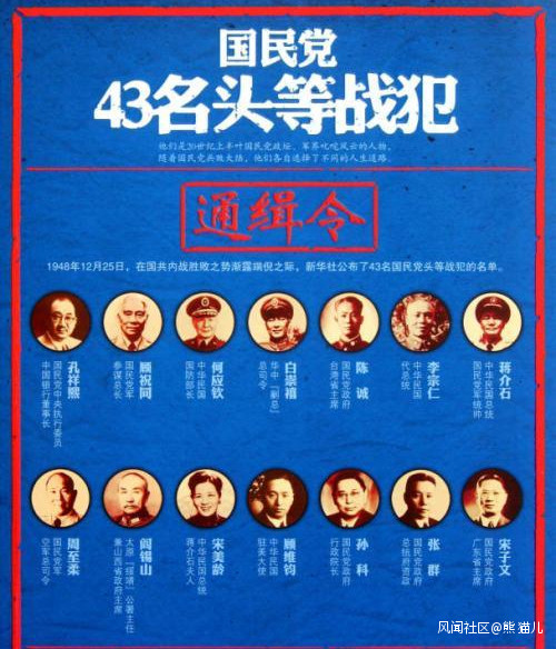 隨後,新華社於1948年12月25日發表《內戰戰爭罪犯名單》,並刊登於12月27日的《人民日報》上,將蔣介石、李宗仁、陳誠、白崇禧、何應欽、顧祝同、陳果夫、陳立夫、孔祥熙、宋子文、宋美齡、衞立煌、胡宗南、傅作義、閻錫山、杜聿明、湯恩伯、孫立人等43人列為“頭等戰犯”。名單基本上囊括了當時國民黨政府黨政軍大員。也就是説在20世紀前半期中國國民黨政壇上叱吒風雲的主要人物在其中。名單特別點名在淮海戰役中被俘的國軍第十二兵團司令官黃維,“在作戰中施放毒氣,即已充分地構成了戰犯資格”。