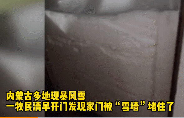 在內蒙古包頭,一牧民開門發現風吹雪堵了半截門,門口出現了雪牆,積雪深度達1米。