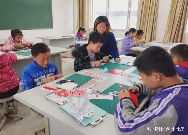 剪紙社團的同學們拿着剪刀,剪出了自己心儀的圖案,有剪壽字的,有剪愛心的,各具特色。