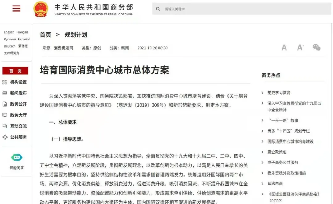 2020年11月,黨的十九屆五中全會通過的 《中共中央關於制定國民經濟和社會發展第十四個五年規劃和二〇三五年遠景目標的建議》再次提出,全面促進消費,培育國際消費中心城市。今年7月,經國務院批准,上海市、北京市、廣州市、天津市、重慶市,率先開展國際消費中心城市培育建設。