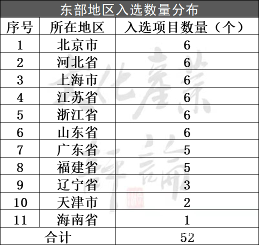 從區域數量分佈來看,東部地區11省份入選的52個項目(省均4.72個)中,北京、河北、上海、江蘇、浙江、山東6省份均入選6個項目,領跑東部第一方陣;廣東、福建2省份各入選5個項目,居第二方陣;遼寧、天津、海南3省分別入選3、2和1個項目,均低於全國省均3.75個和區域省均4.72個入選數量。其中,海南作為東部旅遊大省在該領域首次墊底,出乎意料。