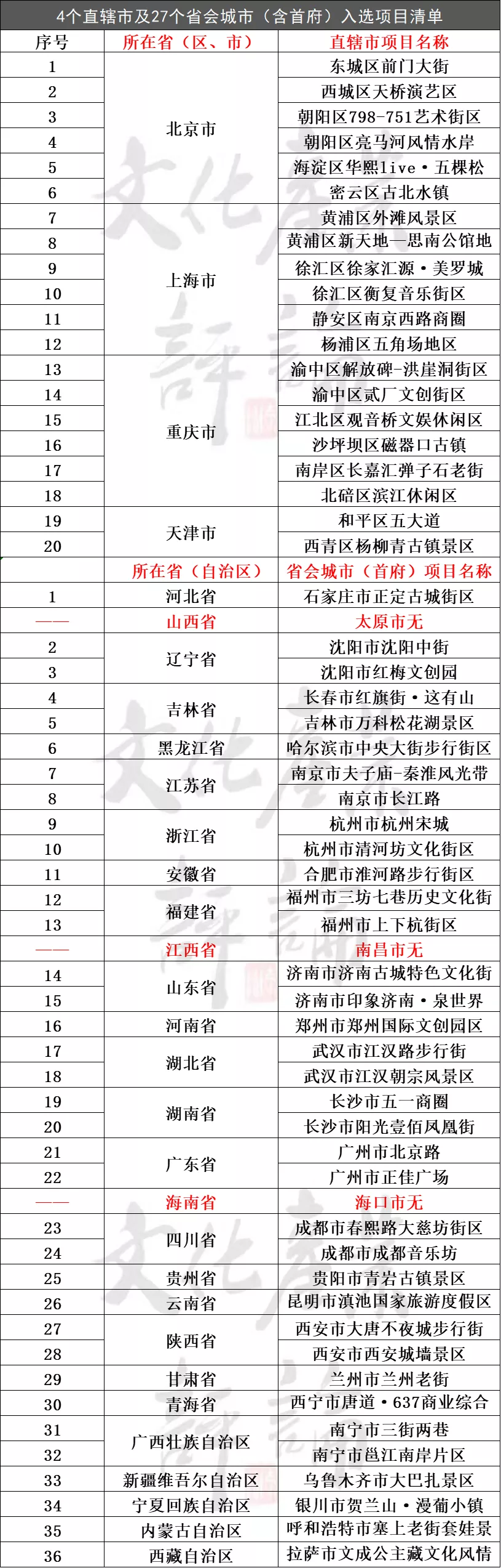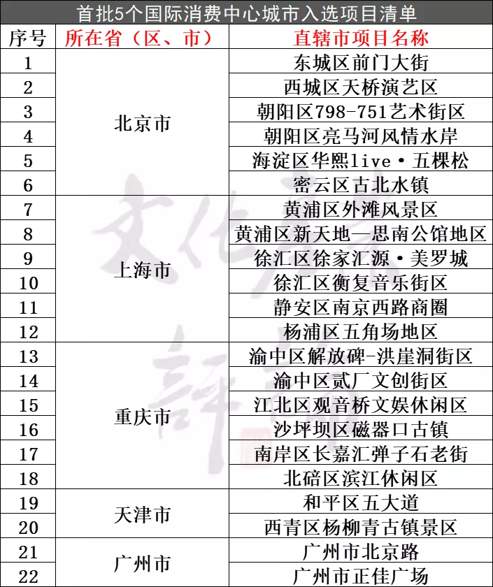 特別值得注意的是,在31個省份和新疆建設兵團首批入選的120個夜間文旅消費集聚區項目中,涉及北京、上海、天津、重慶、廣州等國務院確定的首批國際消費中心試點城市的項目共有23個,佔項目總數的19.17%。其中,北京、上海、重慶3市各6個項目,天津和廣東各2個項目。