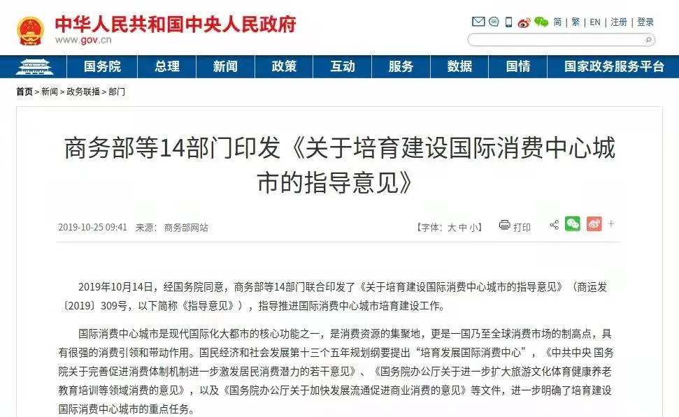 10月26日,國家商務部印發的《培育國際消費中心城市總體方案》(商運發〔2019〕309號)明確,將圍繞國家區域重大戰略和區域協調發展戰略部署,分步分批選擇若干基礎條件好、消費潛力大、帶動作用強、國際化水平較高的城市,培育建設國際消費中心城市,形成優勢互補、錯位發展、聯動互促的國際消費中心城市發展佈局。