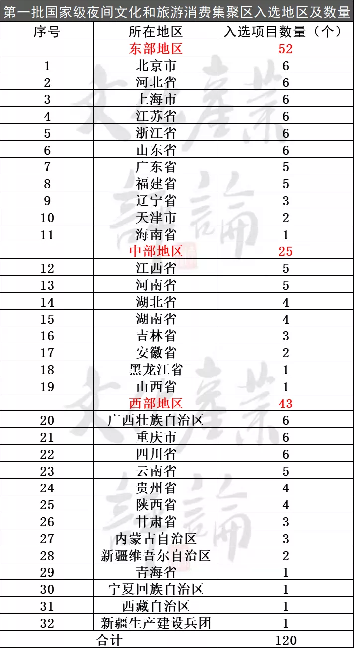 10月19日,文化和旅遊部公佈了首批國家級夜間文化和旅遊消費集聚區名單,共有31個省份和包括北京東城區前門大街、天津和平區五大道,新疆建設兵團等在內的120個項目入選。從首批名單區域分佈及數量來看,具有鮮明的區域差異性和內在的必然性。
