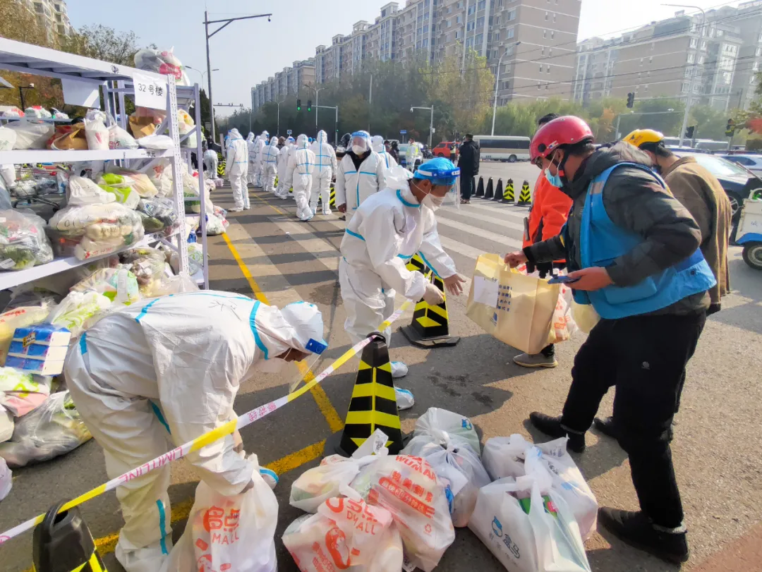 ▲11月3日,北京市昌平區天通苑北二區,外賣小哥將居民訂購的生活物品交給防疫人員轉送。圖/中新圖片
