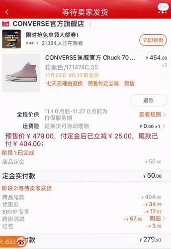 11月1日10點多,劉小姐再登錄匡威旗艦店時,發現她預購的同款鞋子,在減去店鋪優惠120元、88VIP專享29.40元和跨店滿減120元后,僅需付款558.50元。