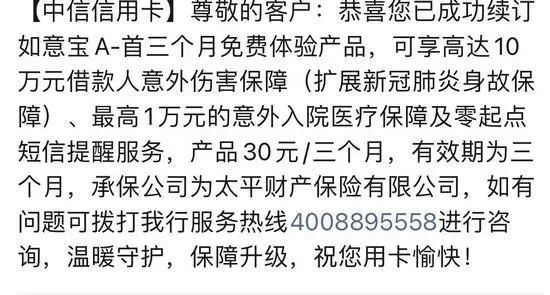 “沒買過這個產品,但卻收到了銀行的短信通知,也不知道如何取消。”一名消費者告訴中新網,自己的信用卡被中信銀行無故續訂了一項名叫“如意寶A”的增值服務。
