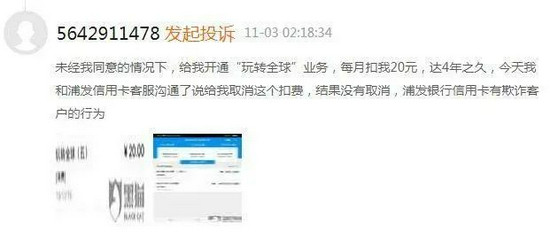 在某投訴平台上的關於銀行信用卡亂扣費的投訴。 “未經我同意的情況下,浦發銀行給我開通‘玩轉全球’業務,每月扣我20元,達4年之久。”一名消費者在投訴平台上反映。而浦發銀行被投訴的隱藏消費中,還包括了“玩轉分期”、“健康管家”、“福袋”等收費項目。