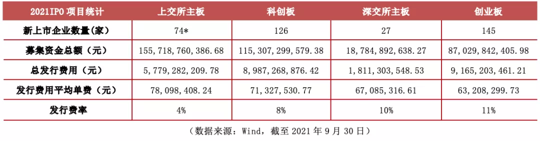 從Wind數據來看,2020年,A股IPO總的發行費用達到306.62億元,相較2019年度已翻倍。上市公司整體發行費率為6.52%,較2019年上漲1.28個百分點。截止2021年9月為止,A股IPO的發行費用達到236.50億元,整體發行費率約為6.42%。