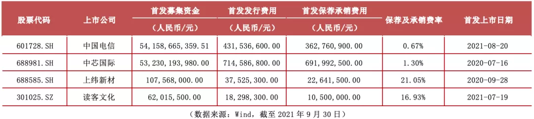 以2020年登陸科創板的明星股“中芯國際”為例,募集資金532.3億元,其保薦及承銷費用為6.92億元,保薦費率費率為1.30%,總髮行費用達7.15億元,甚至超過中國電信的發行費率。