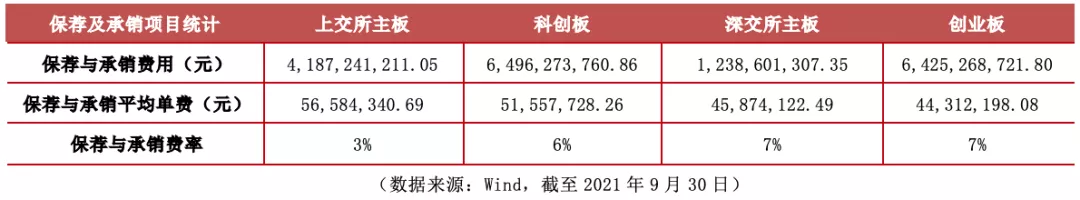 保薦及承銷費率也是通過企業與中介機構協商約定。整體來看,保薦及承銷費率具有一定浮動區間,從1%至20%不等。目前上交所主板、科創板、深交所主板以及創業板的保薦及承銷費率基本持平,普遍在6%-8%。同時,保薦及承銷費用一般有保底要求,所以對於集資規模較小的IPO項目,其費率相對較高。