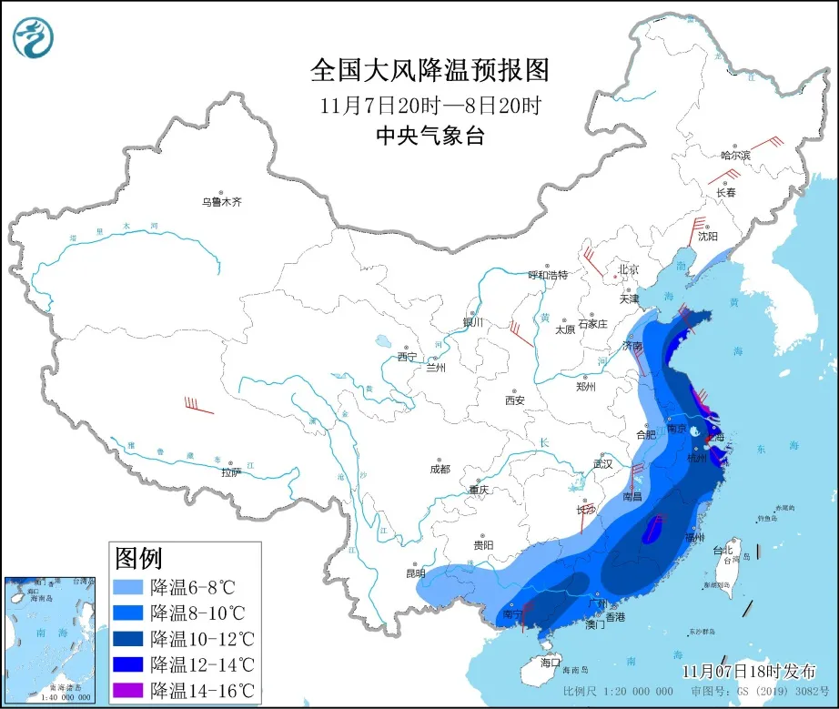 中央氣象台發佈公告稱:受寒潮影響,預計11月7日20時至8日20時,黃淮東部、江淮東部、江南東部和南部、華南中東部等地部分地區將出現8~10℃降温,其中山東東南部、江蘇東部、上海、浙江東北部、福建西部等地部分地區降温幅度可達12~14℃,局地14℃以上,並伴有5~7級偏北風、陣風8~10級;降温過後,最低氣温0℃線位於蘇皖北部、河南南部至四川北部一帶,華南中北部最低氣温將降至10℃以下。