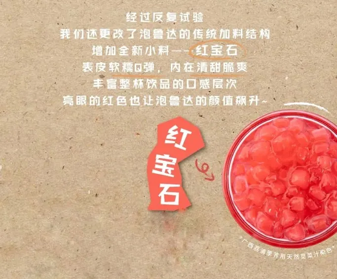古茗、CoCo都可等品牌還對其進行了升級。古茗的紅寶石小料,外面一層皮,內部包裹的是荸薺,還用天然莧菜汁染成紅色。CoCo都可最近上新的閃光爆爆茶中添加的馬蹄爆爆珠在陽光下看起來光澤感十足,頗像珍珠,因其高顏值還在社交平台引來不少打卡。