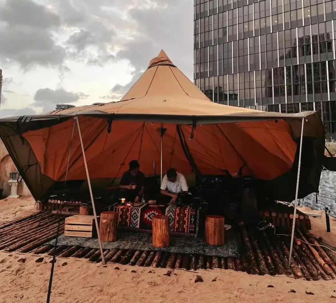 為了營造足夠的“露營感”,GAT露語用的是非常“野”的帳篷類型,與周遭寫字樓形成鮮明的對比。