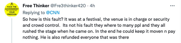 此前,還有Travis Scott的粉絲替他喊冤,大概意思就是説歌手在台上表演時,很難得知場下發生了什麼事,這事兒不怪Travis,要怪也只能怪組織者: