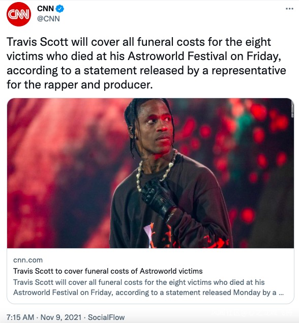 根據最新消息,Travis Scott表示他願意向在Astroworld Festival天文世界音樂節事故中的失去生命的8人支付喪葬費用,以及為在事故中遭受了心裏創傷的人提供心理諮詢上的幫助。