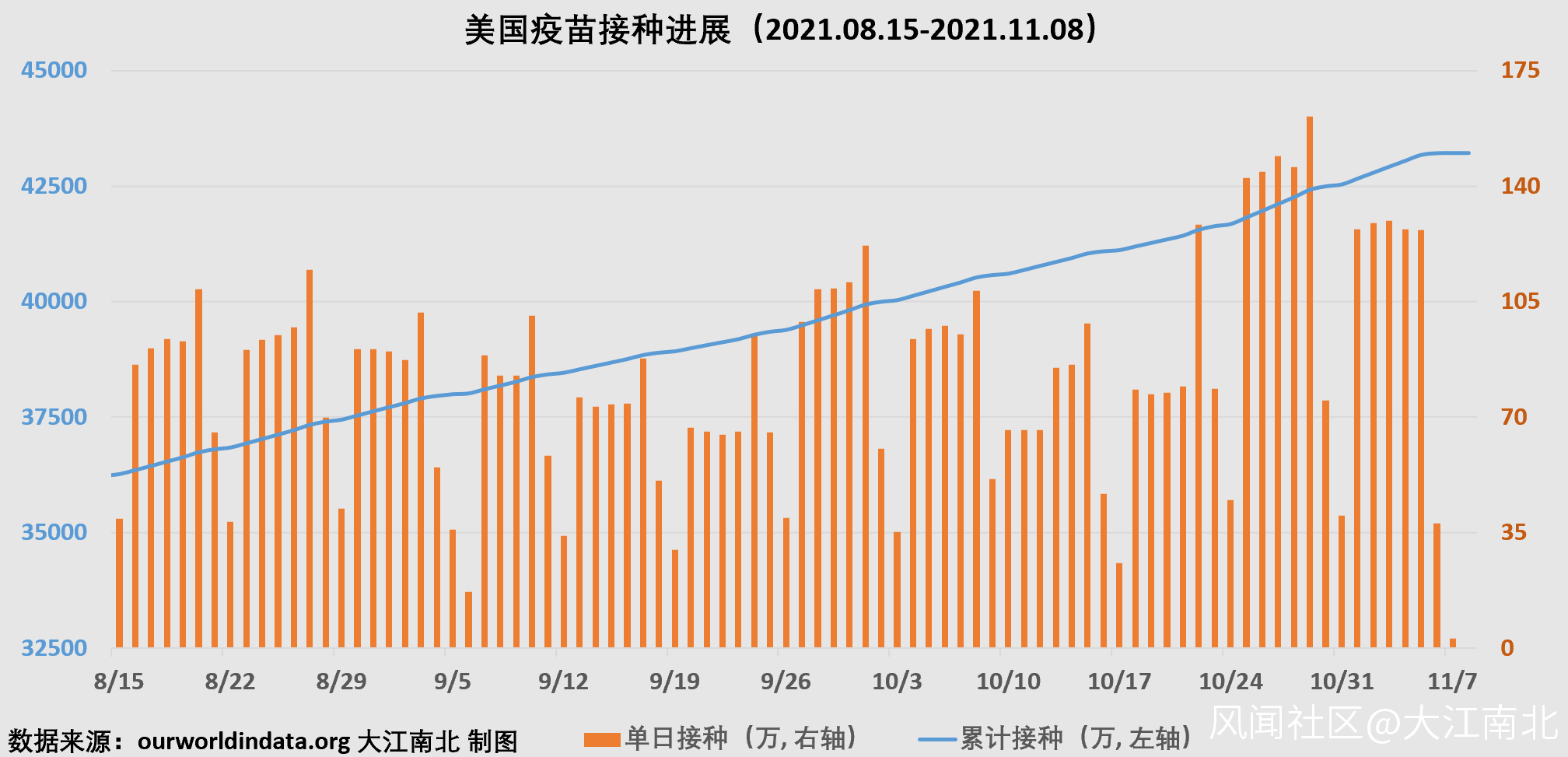 截止2021年11月8日,美國累計接種4.3211億劑,居全球第三位;美國每百人累計接種128.47劑,比中國低37.17劑,是中國的77.6%。