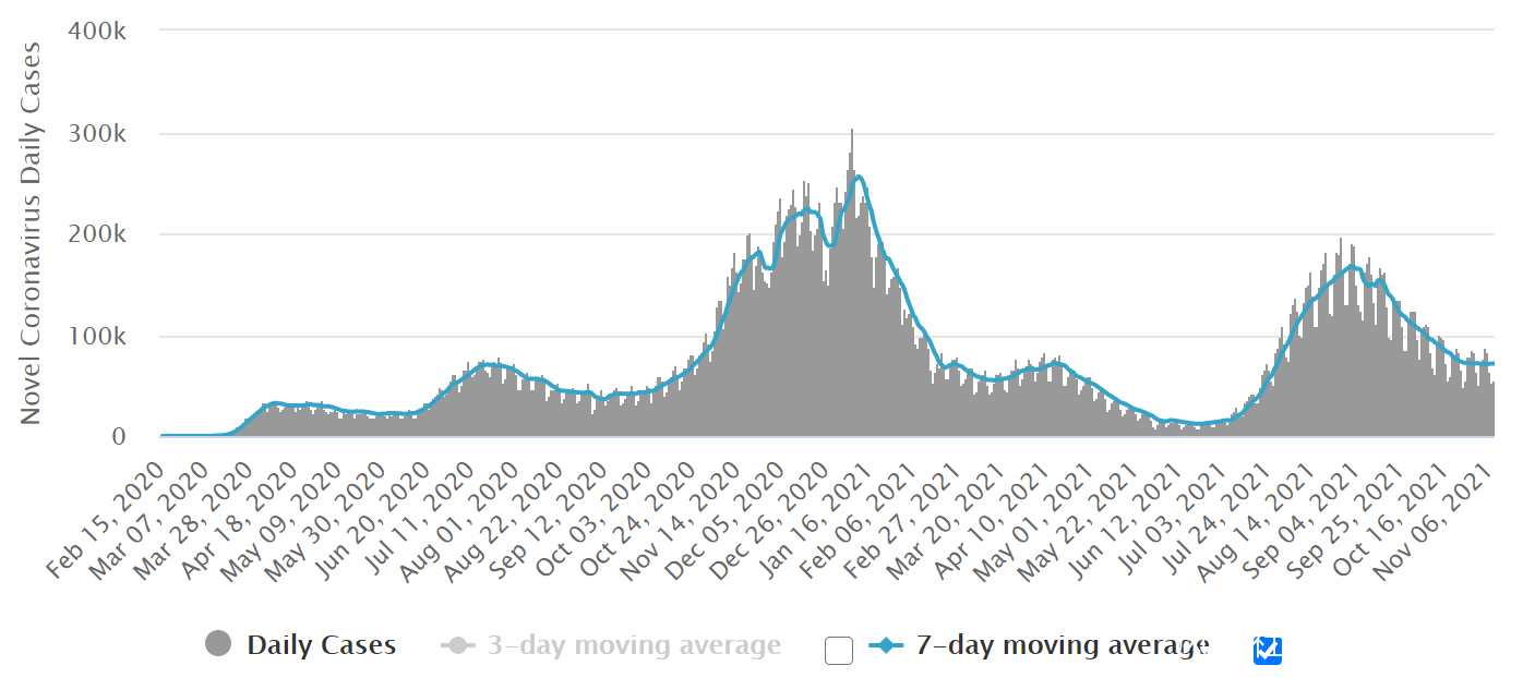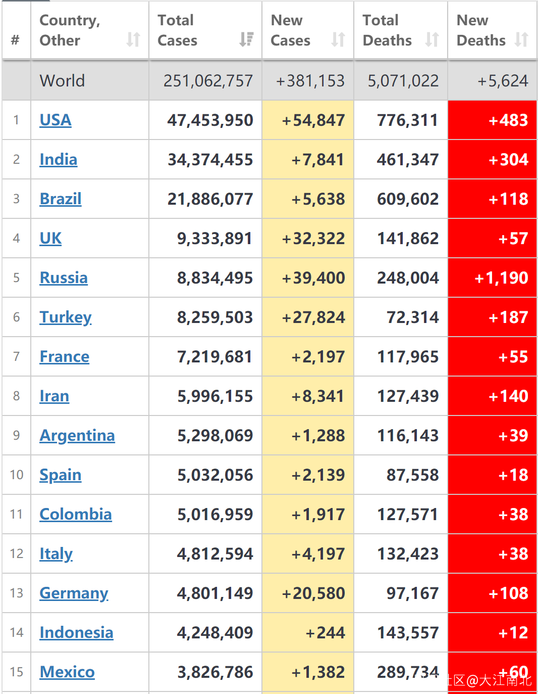 11月8日,全球新增新冠確診381,153例;累計確診2.5106億例;新增病亡5,624例;累計病亡507.10萬例。隨着北半球冬天的到來,全球第五波疫情逐漸展開。