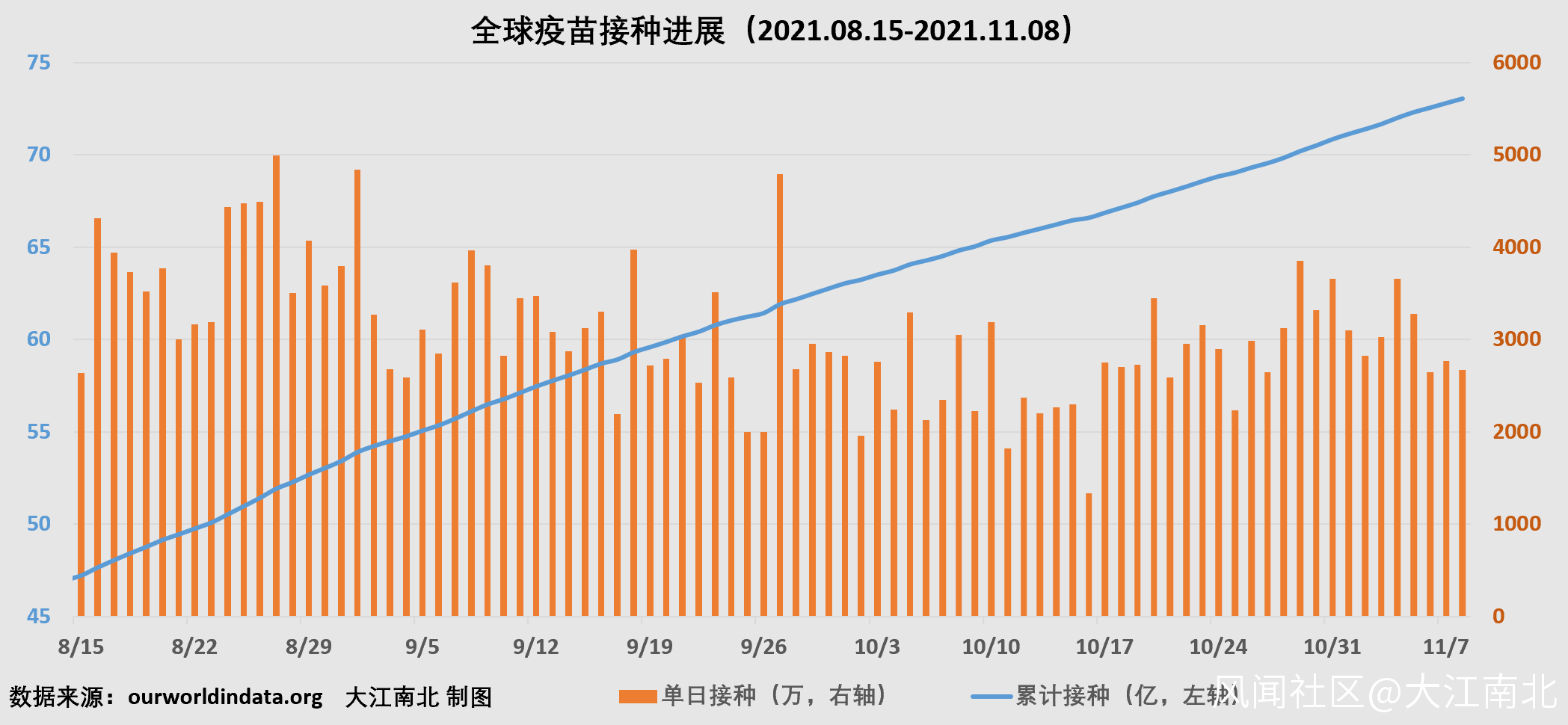 截止2021年11月8日,全球累計接種新冠疫苗73.07億劑;其中單日接種2669萬劑;平均每百人接種92.79劑,環比增加0.31劑。