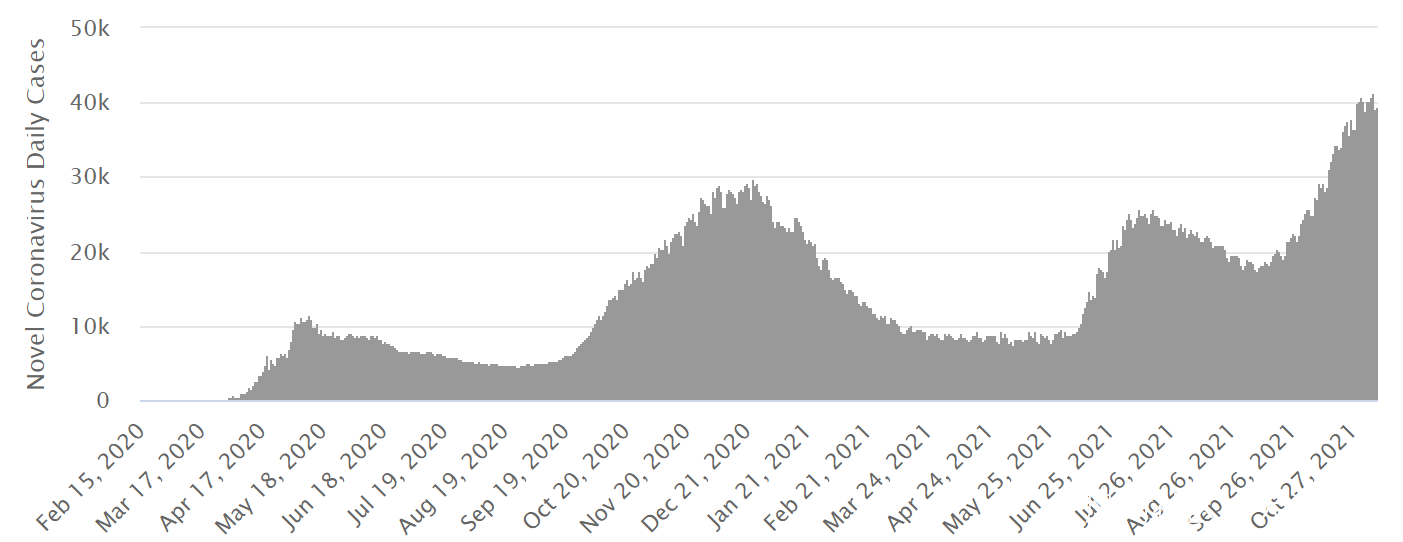 俄羅斯單日新增確診病例(2020.02.15-2021.11.08**)**