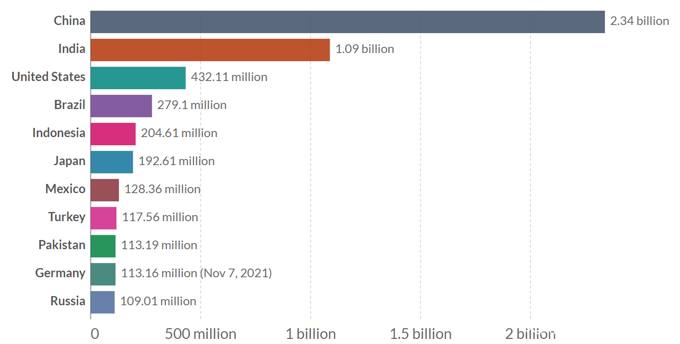 巴西、印尼、日本、墨西哥、土耳其、巴基斯坦、德國分列四到十位,其中巴基斯坦超過德國列第九位。
