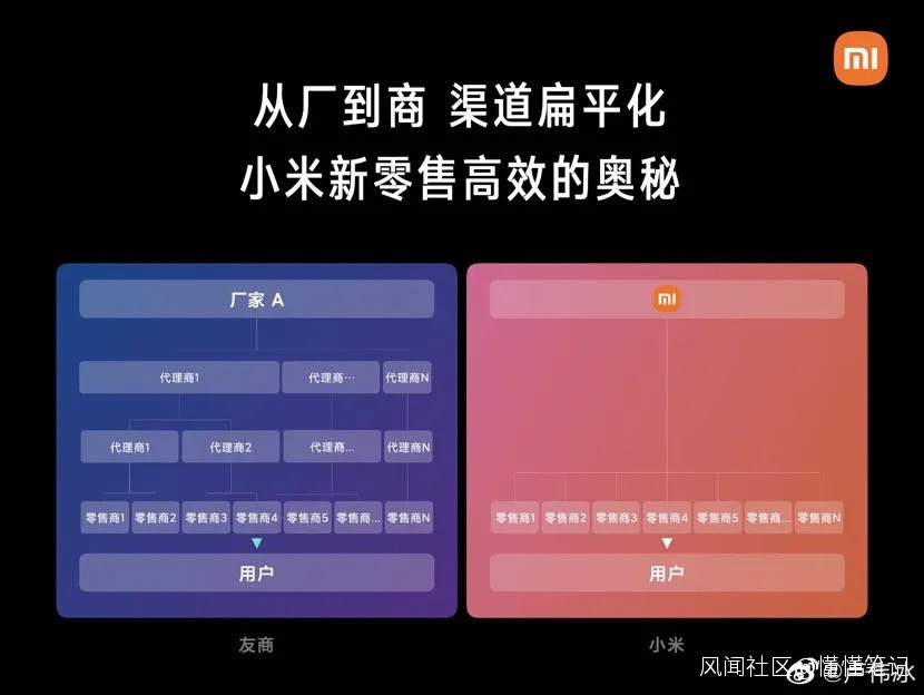 然後是新模式,即以最扁平的模式觸達用户。傳統渠道都是層層分銷,效率在層層流轉中被消耗。而小米的新零售是在品牌與用户之間建立最短路徑,中間的利潤全部讓利給用户。