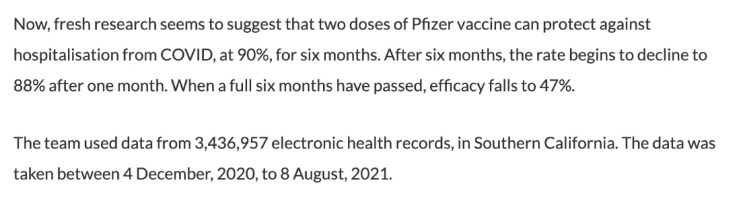 美國公共衞生研究所(Public Health Institute) 、退伍軍人事務醫學中心和德克薩斯大學健康科學中心分析了 780,225 名退伍軍人的疫苗接種情況。研究人員發現**,**所有疫苗類型(輝瑞強生摩德納)對任何一種COVID-19 感染的保護都下降,總體疫苗保護從 2 月份的 87.9% 下降到 2021 年 10 月的 48.1%。