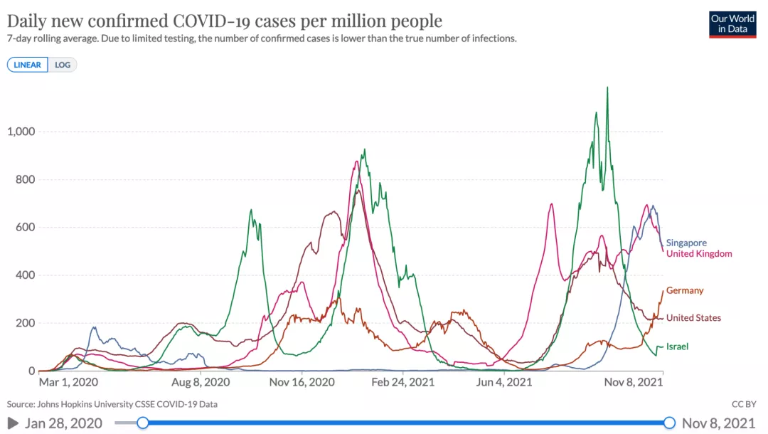 以色列和新加坡的接種率都是世界最高的,但是,以色列和新加坡,在接種率已經遙遙領先,幾乎接近全民接種的情況下,再次爆發疫情高峯。英國,德國,也再次出現疫情。美國,一直每天幾萬十幾萬新增。