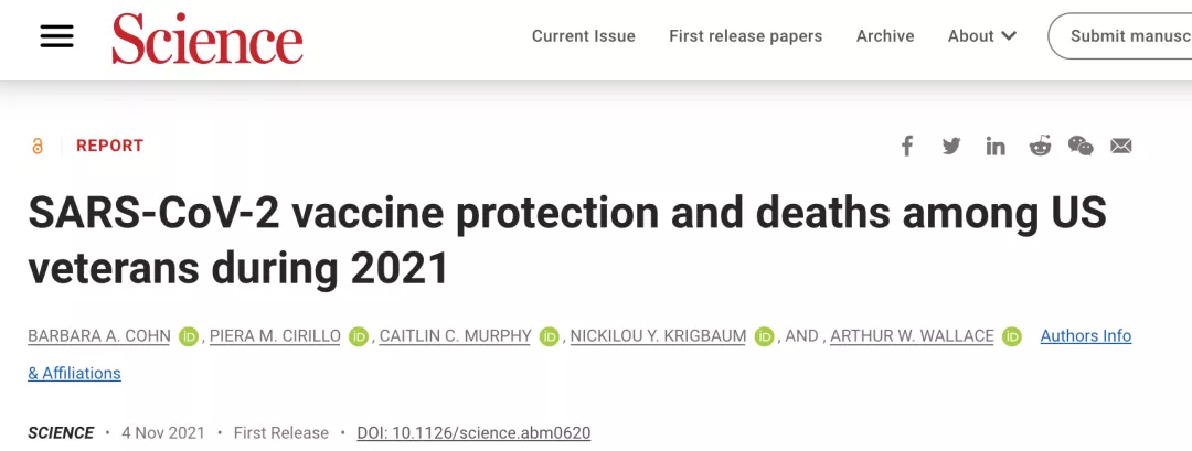 11月4日,《科學》雜誌登出了一篇論文,研究了美國三種新冠疫苗,Moderna、輝瑞和J&J疫苗對美國退役老兵這個羣體的保護率和避免死亡的概率。
