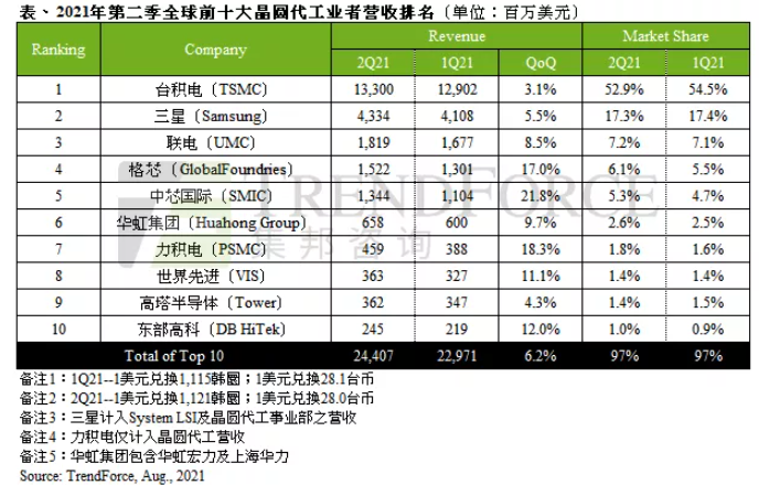 今年第二季度全球晶圓代工市場台積電高達52.9%,三星高達17.3%。