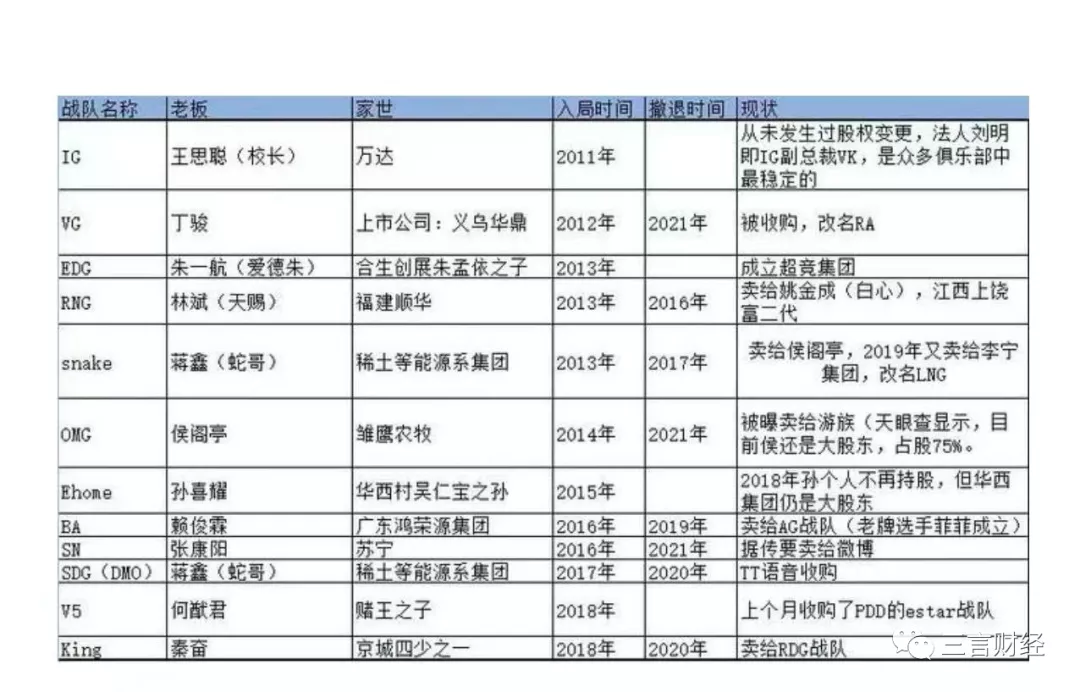 丁駿的VG戰隊被收購,改名為RA;林斌的RNG賣給了姚金成;蔣鑫的snake被賣給侯閣亭後,又被侯閣亭賣給了李寧集團,改名為LNG;侯閣亭的OMG被曝賣給遊族,但天眼查顯示,目前侯閣亭還是大股東;賴俊霖的BA賣給了AG;張康陽的SN,據説要賣給微博;秦奮的king戰隊賣給了RDC……