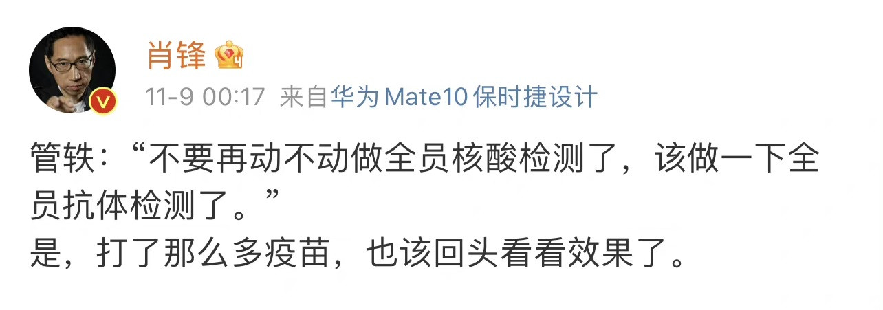 11月8日,管軼在接受鳳凰衞視採訪時呼籲:“不要動不動就做全員核酸檢測了,應該做一下抗體檢測,看看我們的國民接種了疫苗之後,體內到底有多少抗體。”