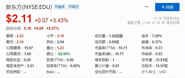 11月8日,多家教育公司盤前股價直線拉昇,高途、新東方漲超30%。收盤時,高途股價上漲10.84%;好未來漲5.4%;新東方股價漲3.43%。