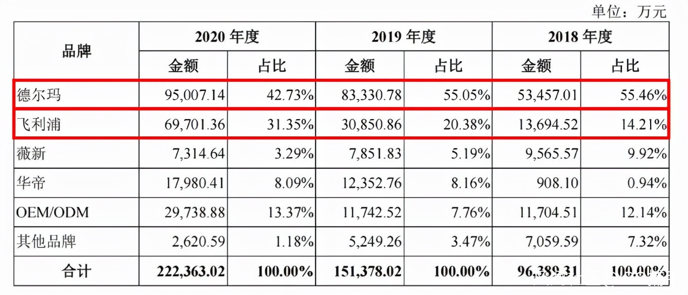 2018年至2020年,德爾瑪銷售飛利浦品牌產品獲得的收入分別為5.35億元、8.33億元、9.5億元,佔德爾瑪總營收比例為14.21%、20.38%、31.35%。