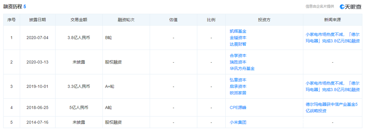 在2018年6月,德爾瑪宣佈完成由中信產業基金投資的5億元A輪融資,這也是其創立以來的首次融資。同年,德爾瑪完成對飛利浦全球水健康業務的併購。隨後,2019年10月、2020年3月、2020年7月,德爾瑪相繼進行了3.3億元A+輪融資、股權融資以及3.8億元B輪融資。