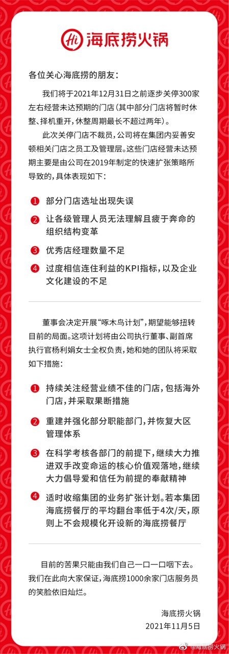 “苦果只能由我們自己一口一口嚥下去。”海底撈發佈前述公告(關停300年左右門店)當日,一封公開信赫然出現在其官方微博上。
