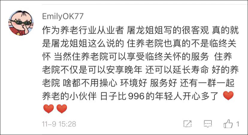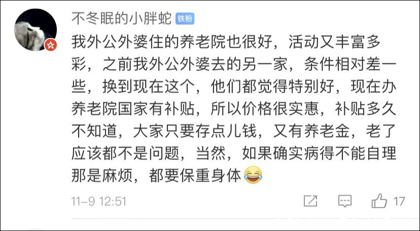 還有養老行業從業者表示,樓主寫的很客觀。“好的養老院啥都不用操心,環境好服務好,還有一羣一起養老的小夥伴,日子比996的年輕人開心多了”。