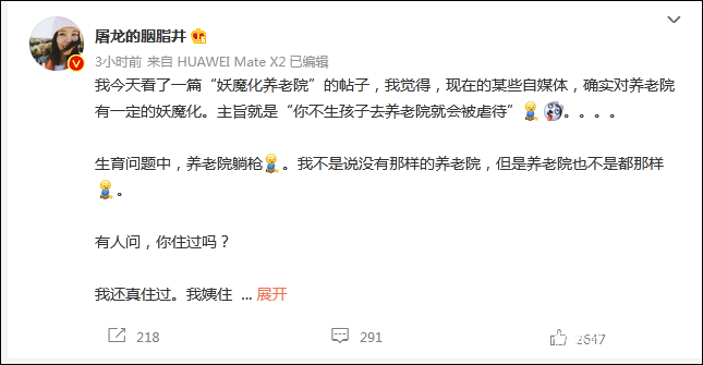 我今天看了一篇“妖魔化養老院”的帖子,我覺得,現在的某些自媒體,確實對養老院有一定的妖魔化。主旨就是“你不生孩子去養老院就會被虐待”。。。。