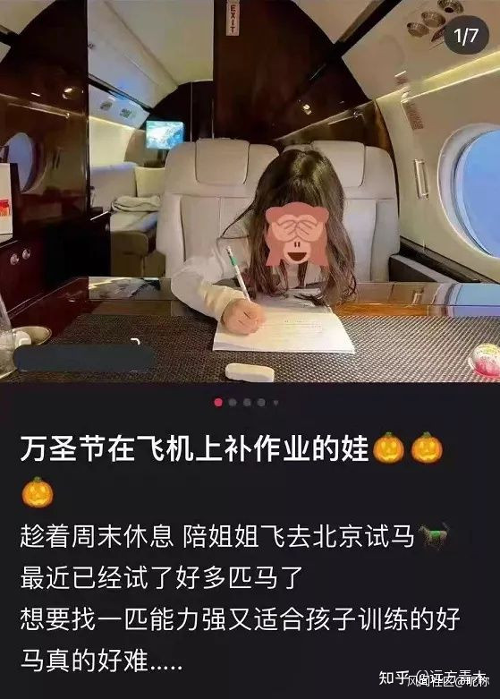 下面這個搞素質教育的孩子真的很勤奮,為了選一匹合適的馬要趕飛機,在飛機上還要爭分奪秒的補作業。