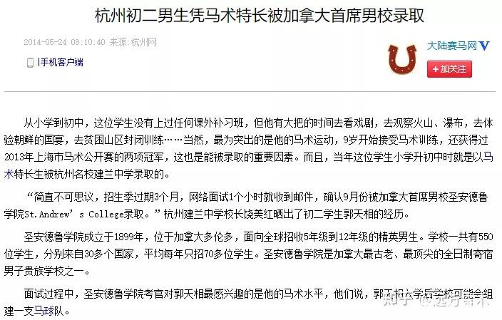 2014年,一名杭州初二男生僅憑馬術獎牌就被加拿大首席男校錄取,這家學校覺得他可以來學校裏組建馬球隊。