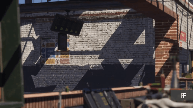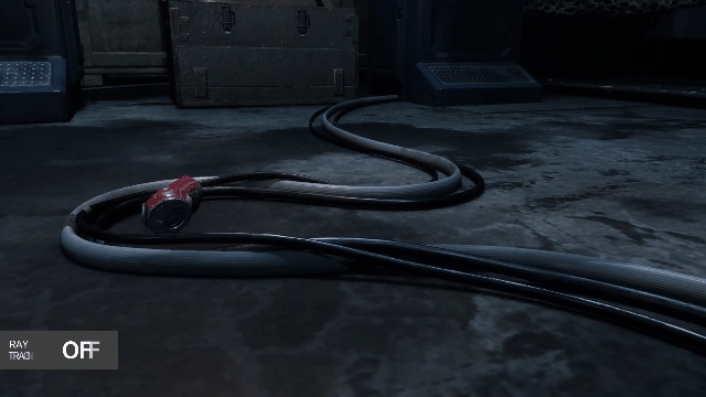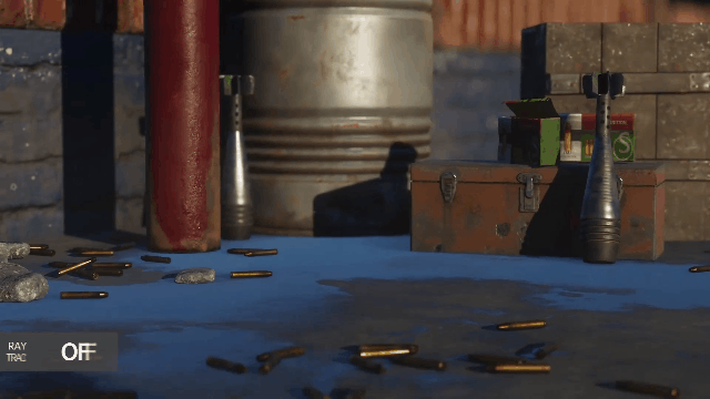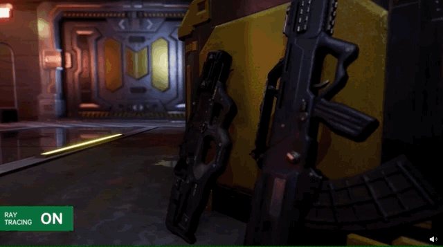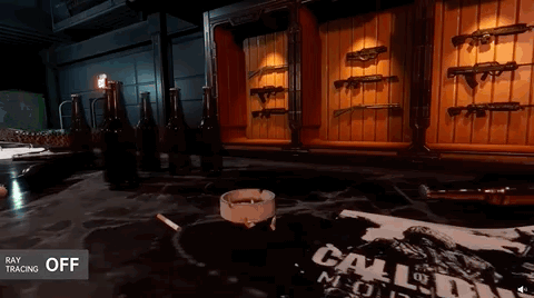 從圖中可見,牆壁上展示的槍支和燈光倒影,在開啓光追之後才被顯示出來: